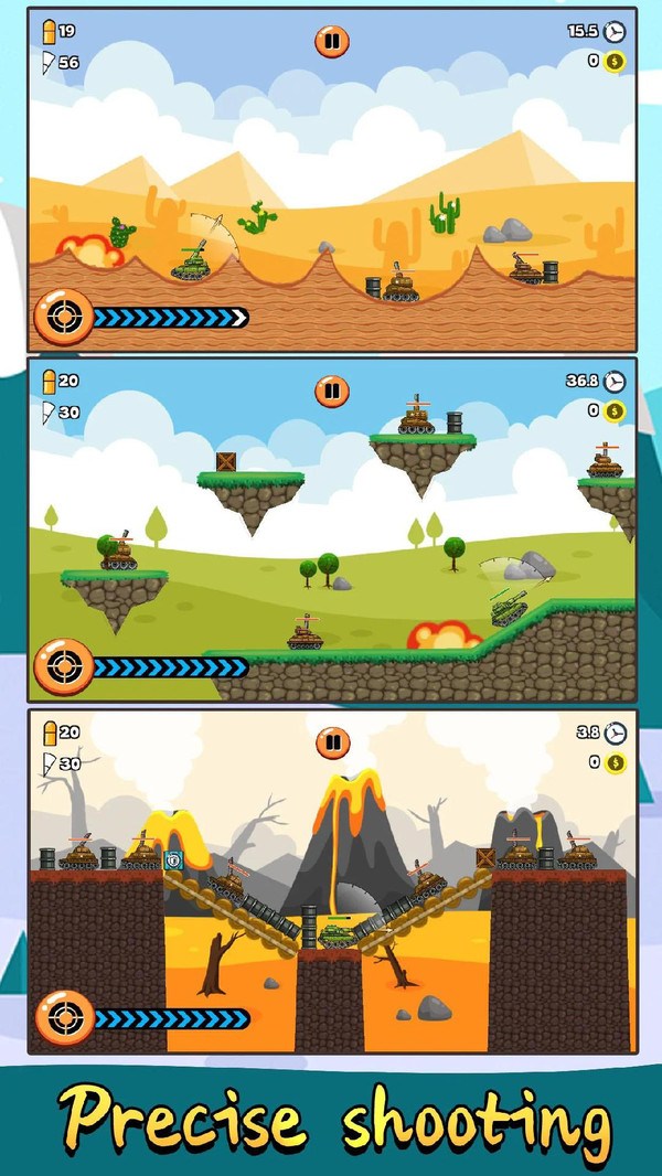 疯狂的坦克是一款好玩的精心策划的休闲益智游戏,你的小坦克总是在森林坦克山谷中射击导弹。有不同的敌人,如在空中飞行的战斗机、随意分布的坦克。克服不同的敌人,成为坦克之神。这是一个重型火炮2d的坦克游戏。带上你的坦克去战斗吧。找到合适的坦克射击角度,瞄准并摧毁小坦克。通过坦克战斗成为坦克明星!通过击败其他坦克,生存并成为坦克英雄!