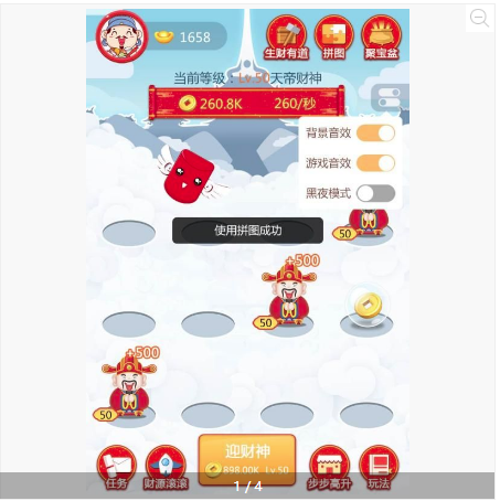 3、游戏中收获众多惊喜,去不断升级财神,解锁新的图鉴合成高级财神。