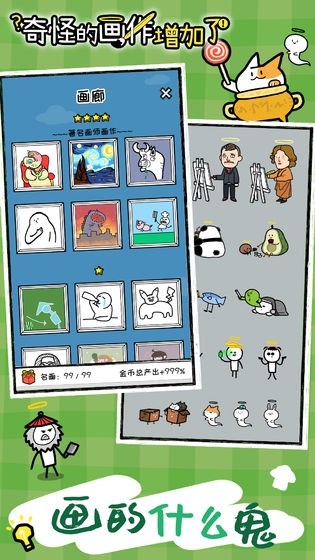 一款佛系挂机游戏,世界各种名画家去世后在天堂又被重新召唤回来继续画画,也是比较惨了,名符其实的灵魂画师,死后都不放过他们,继续榨干他们的脑洞。