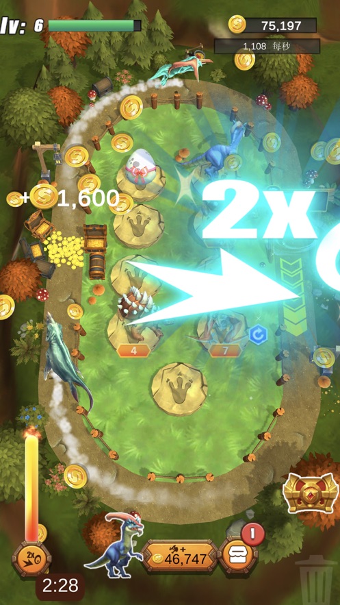 1、随着游戏的进行,越来越高级的恐龙会在游戏之中开放,让你能够购买到更强力的恐龙来帮助你赚取收益;