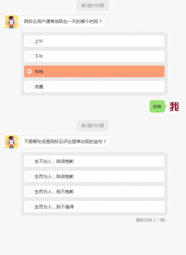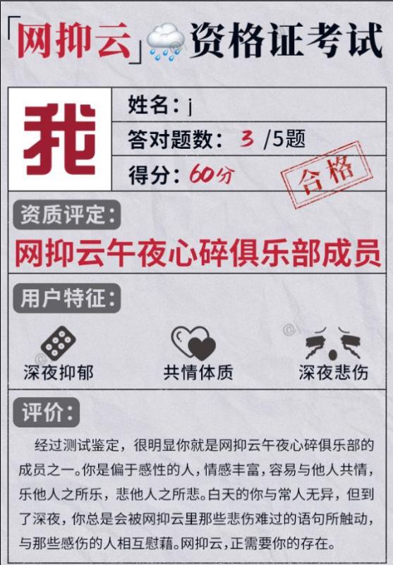 拥有着很多有趣的答题测试玩法可以自由体验,每个问题都直指本心,让你能够深刻了解网抑云用户的内心世界,让你能够更好的融入其中,成为一名资深的网抑云俱乐部成员。