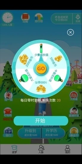 逐梦人生是一款非常有趣的模拟经营类的游戏,十分清爽简约的游戏界面,拥有不同的目录规划,比如天赋、成就、履历等;真实的还原了我们现实生活中的人生轨迹以及内容模式等,比如周岁抓阄等;整个人生模拟过程包含有婴幼儿时期、学前班、小学、初中、高中、大学等。