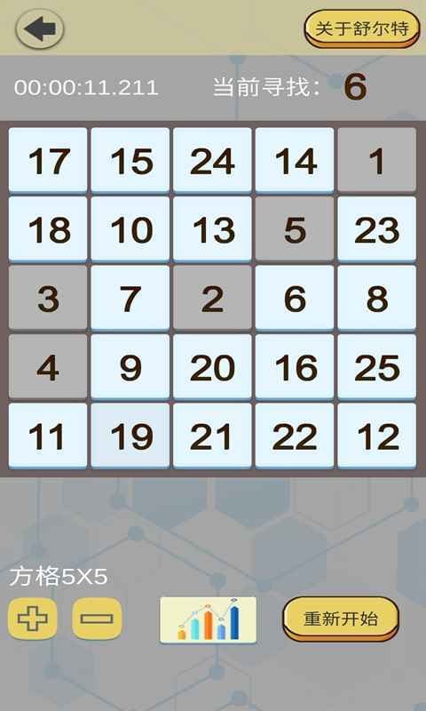 舒尔特表格是一款可以帮助玩家训练注意力的游戏,玩家可以根据自己的能力不断提升格数,你可以看见自己的进步。游戏利用独特的方式锻炼玩家的注意力,让玩家不断地进步。无论你是什么年纪的朋友都可以尝试这款游戏,非常的轻松。