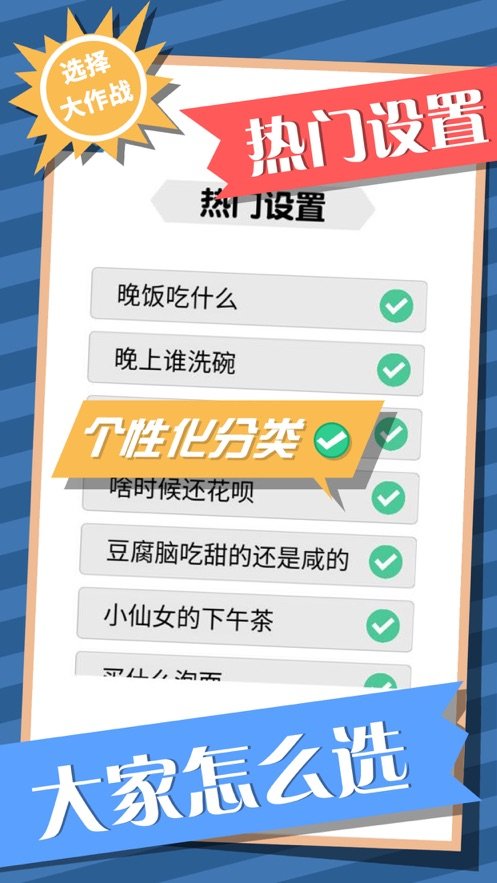 选择大作战游戏是一款充满了趣味性的模拟游戏,游戏界面设计非常的简约细腻,自由的游戏模式没有时间限制,转动转盘,也可以自定义设计转盘里的内容,高度自由的游戏模式,休闲又非常具有娱乐性,超多精彩的选择内容等待玩家来体验。