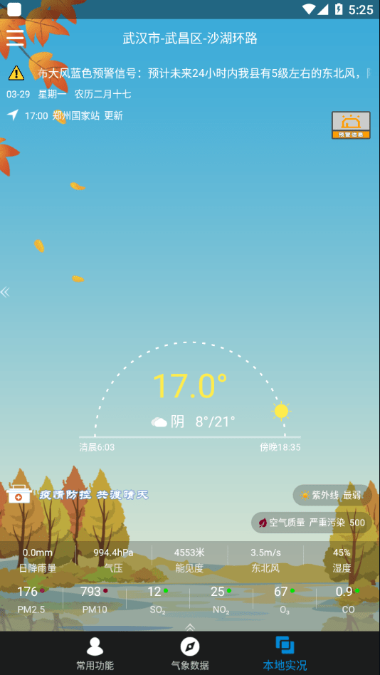 实时获取您当前的位置的国家站权威气象观测数据和空气质量污染指数数据;