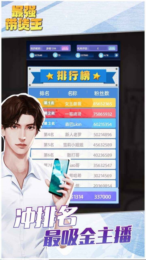 最强带货王能够带你体验非常精彩的模拟经营类游戏,在这里玩家将成为一名直播,开始自己的带货直播之路,游戏玩法十分的新颖,并且你还可以和粉丝进行互动哦,非常的有趣哦,能够带你体验带货直播的游戏的乐趣哦。