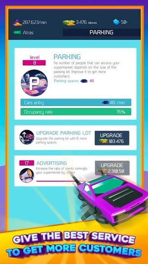 开始经营一家小商店,并努力使您的业务增长。研究新功能拓展业务并吸引更多的客户。建立一个面包店,时尚百货,电子商店或餐厅。卖的最好的产品来吸引客户。服务的卖家,让他们增加您的销售和利润。把你的客户的关怀。为他们提供广泛的选择,坚持在你身边的超市。建设一个停车场,他们可以放心地把车停和购物。您可以吸引到您的超市顾客越买,越现金,你可以得到的。