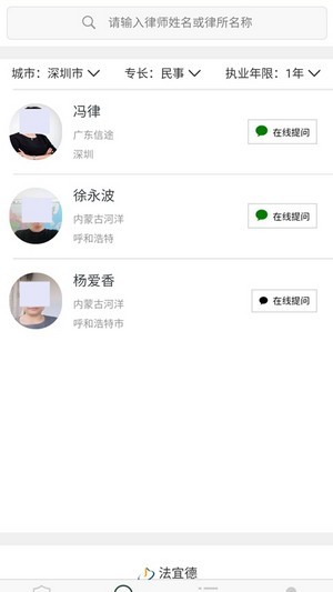 法宜德app能够给你提供非常优质的法律服务,这里有着海量的律师,你可以直接在线资讯各种法律问题,让你足不出户解决相关的法律问题,让法律服务触手可及,为您的人生保驾护航!