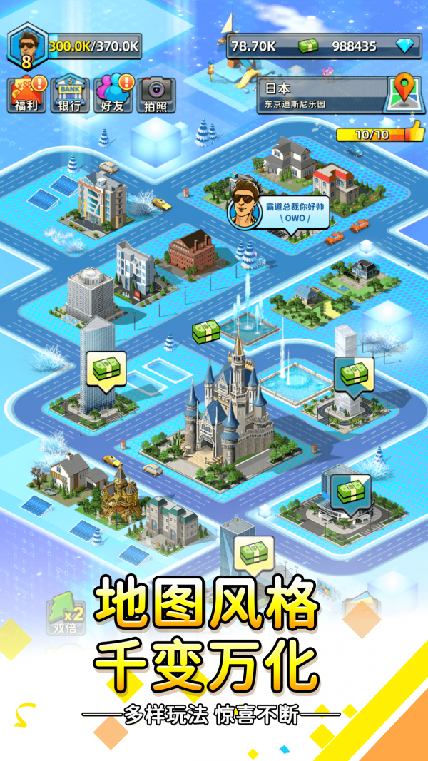 1、轻松放置赚钱,细腻的游戏画面内容!不断地拓展投资,招募更多的商业精英,享受豪华人生,玩法超多!