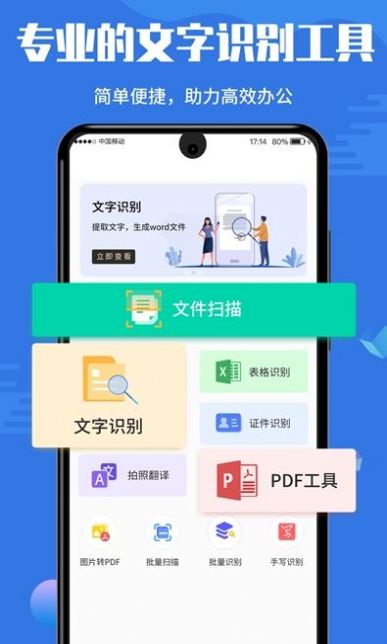 1、一款专业的智能文字识别工具,可以随时进行手机软件扫描,提取出所有的文字内容。