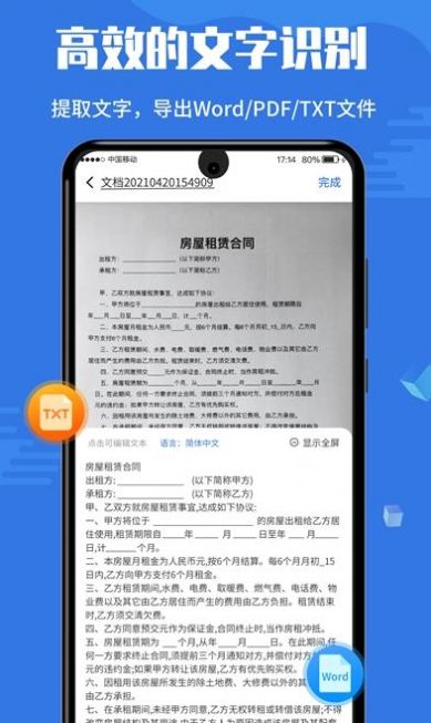 2、拥有高效的文字识别功能,并且支持导出Word/PDF/TXT等文件内容,还有各种证件扫描保存使用。