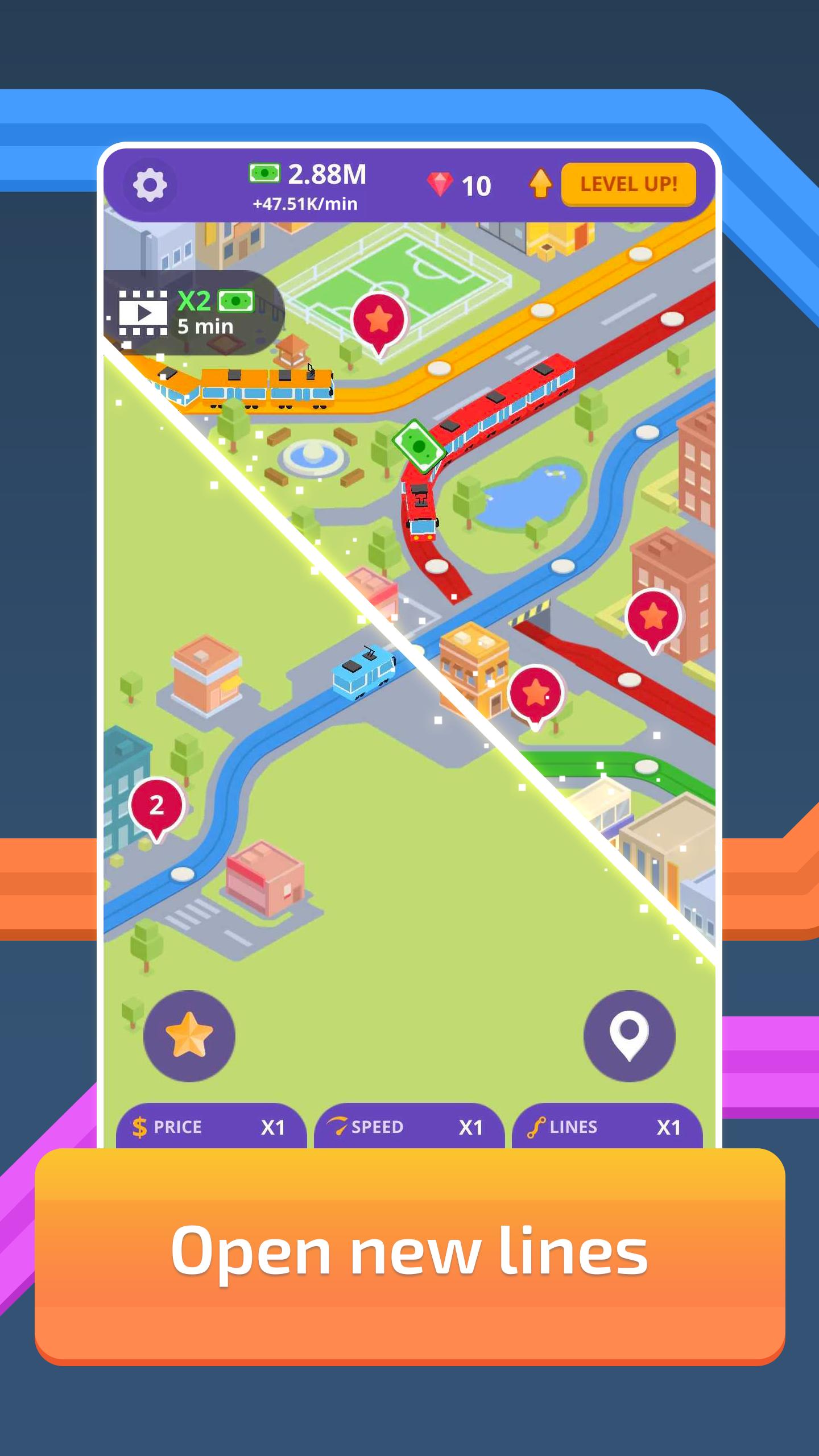 空闲火车大亨带你体验卡通画风的模拟经营手游,玩家在游戏中将成为一名铁路经营者,你所需要做的就是开始建设你的火车线路,慢慢的经营出一个最大的运输网络复盖整个城市。