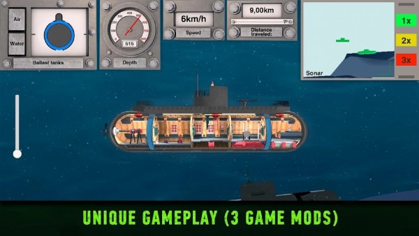 这款游戏操作的方式十分的有趣,模拟着这是的开潜艇的方法,通过水以及空气的控制来控制潜艇的高度让它能顺利的躲避海下的障碍前进。