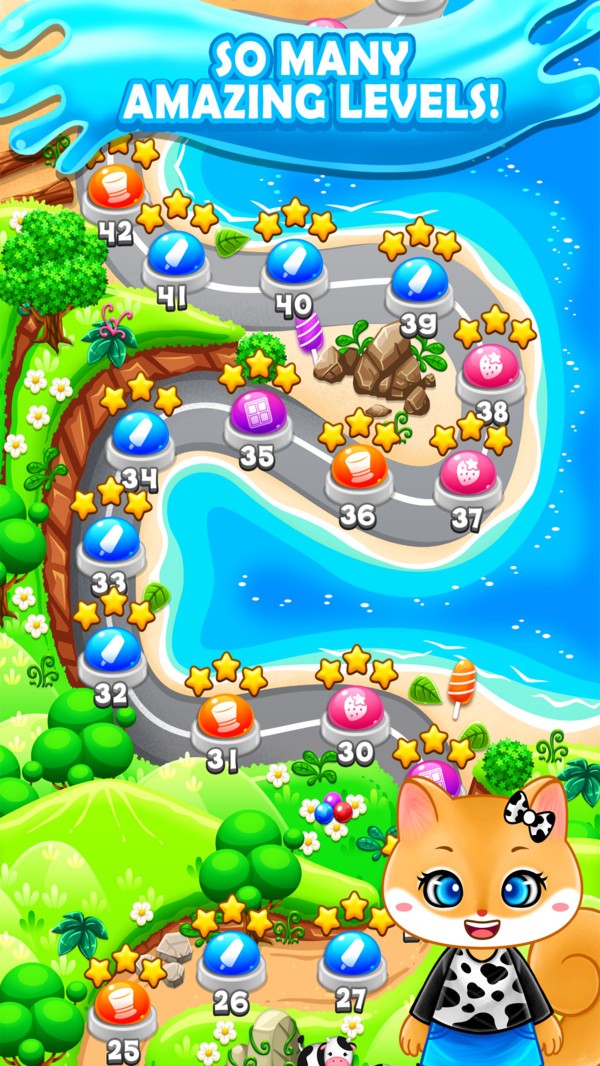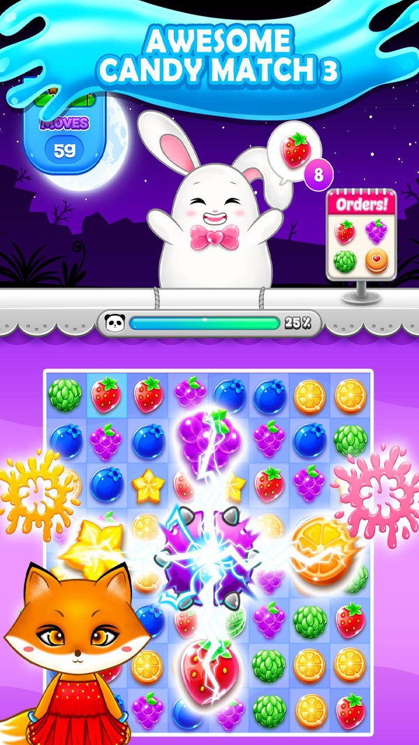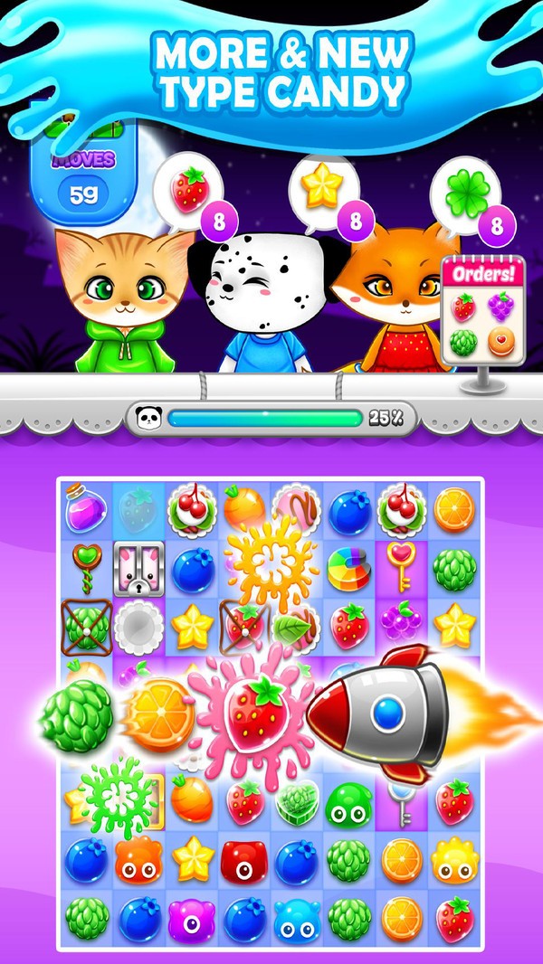 并且制作十分可爱的消除类闯关游戏,在这里玩家要做的就是消除那些看起来十分美味的水果糖,其中有着各种不同的种类,同时还有着丰富的关卡数量,在这里玩家要做的就是使用各种各样不同的办法,不管是交换还是道具,总之就是要将其中的元素消除,一次性消除的越多,能够获得的积分就会越高,也会更容易通关。