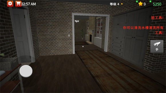4、进入房间后可以点击右侧的手来切换使用的工具,需要先把桶放在地上,然后用拖把或者海绵来清理。