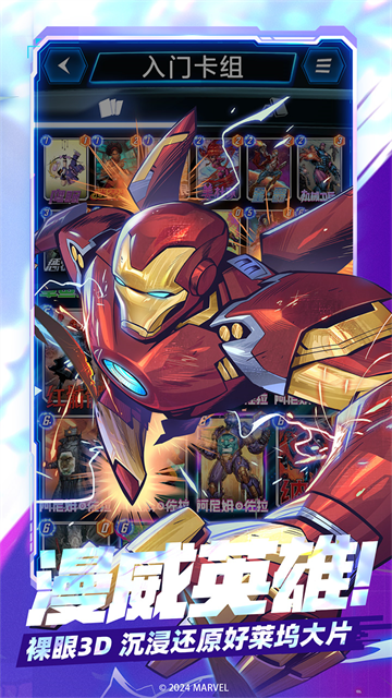 1. 动态卡面与史诗级美术:每张卡牌均采用动态立绘设计,从静态图像逐步过渡至3D视角,终极卡牌更可触发彩虹分裂特效填满牌库,搭配漫威原声音乐与场景音效,还原电影级战斗氛围。